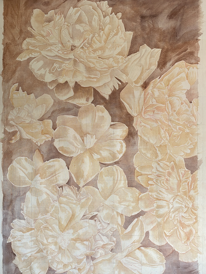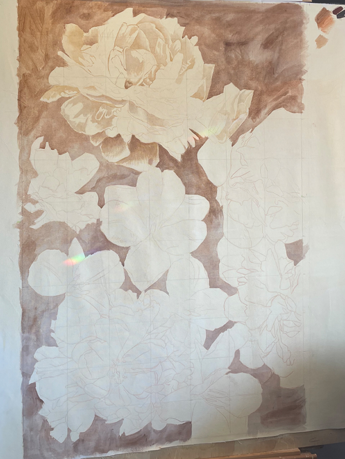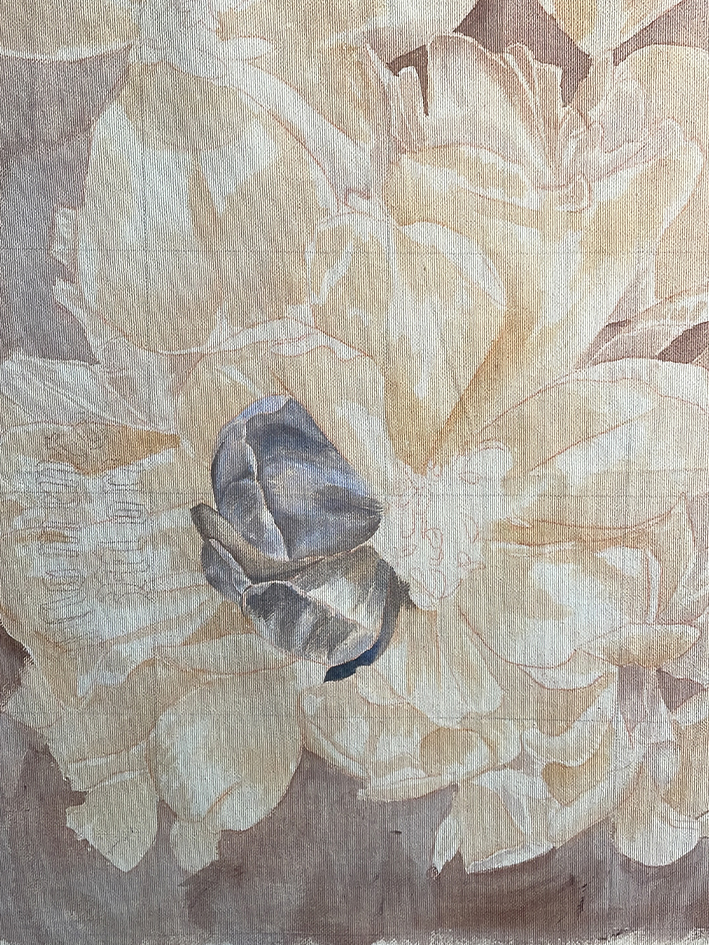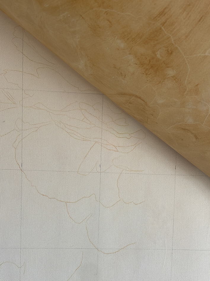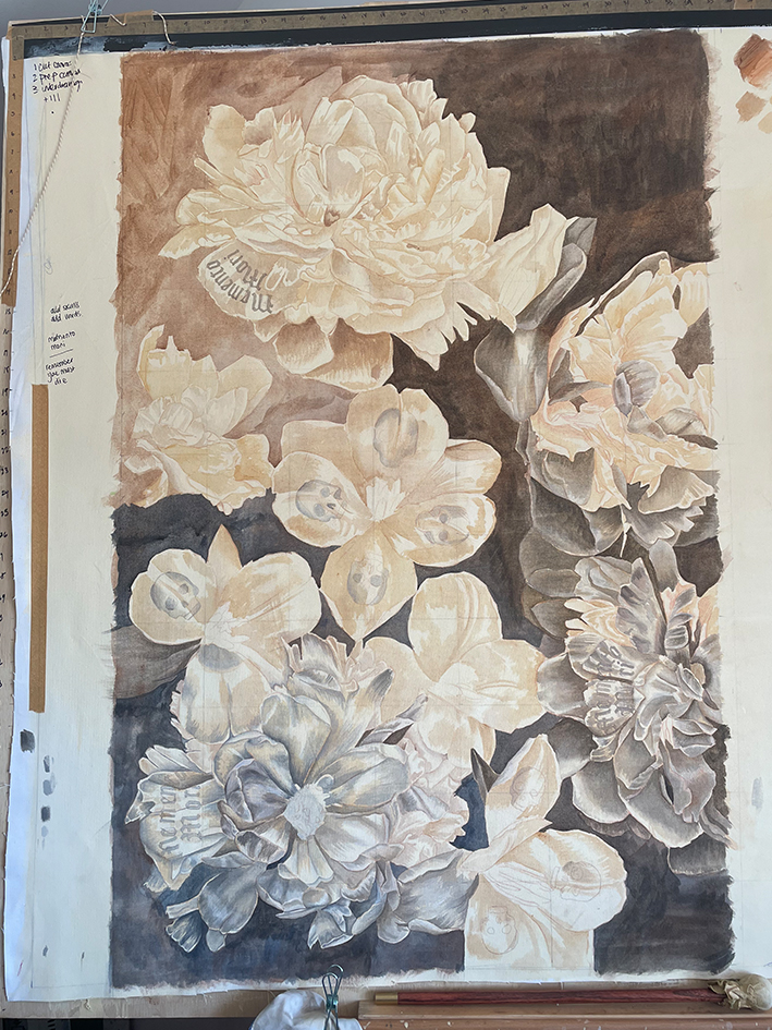Below are progress images showing WIP of Memento Mori, working through several layers, to finally arrive at the grisaille layer. Starting with a wash on the raw canvas and a grid system to draw out my first layer of details. Then working up with umber washes to key in the shadow details and some lighter areas. Next working in more details on the grisaille, or ghost layers. Canvas size 28″ x 48″.