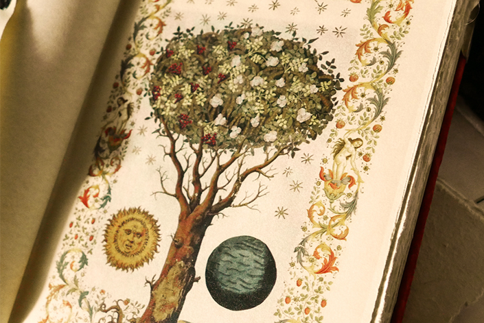 In the story our main character finds, and is led by a magical prophecy book with storytelling illustrations, which guides her journey. The illustrations were based on prophecies from the original book. Each was designed with meaning and certain elements from the scripts woven in. The illustrations were printed on vellum and bound into the prophecy book, which was bound in a custom velvet. I created these illustrations digitally in Photoshop with reference materials, and working this way allowed me to make edits faster to keep up with the changing scripts. Once printed I hand-embellished the pages with gold details.