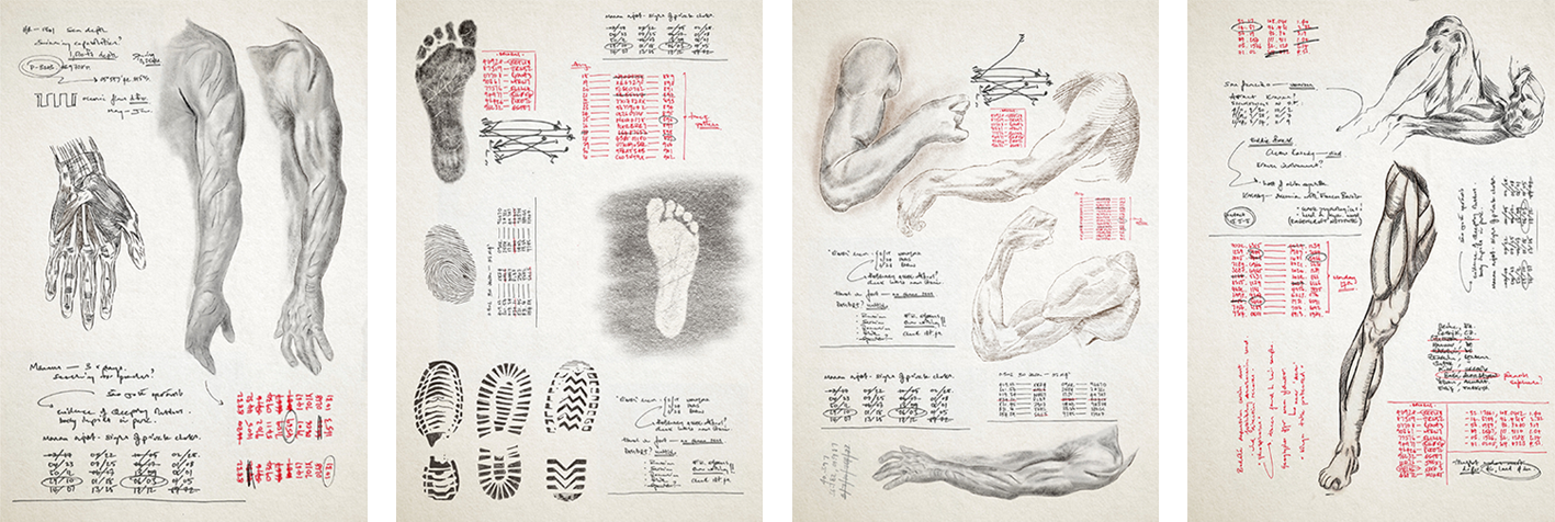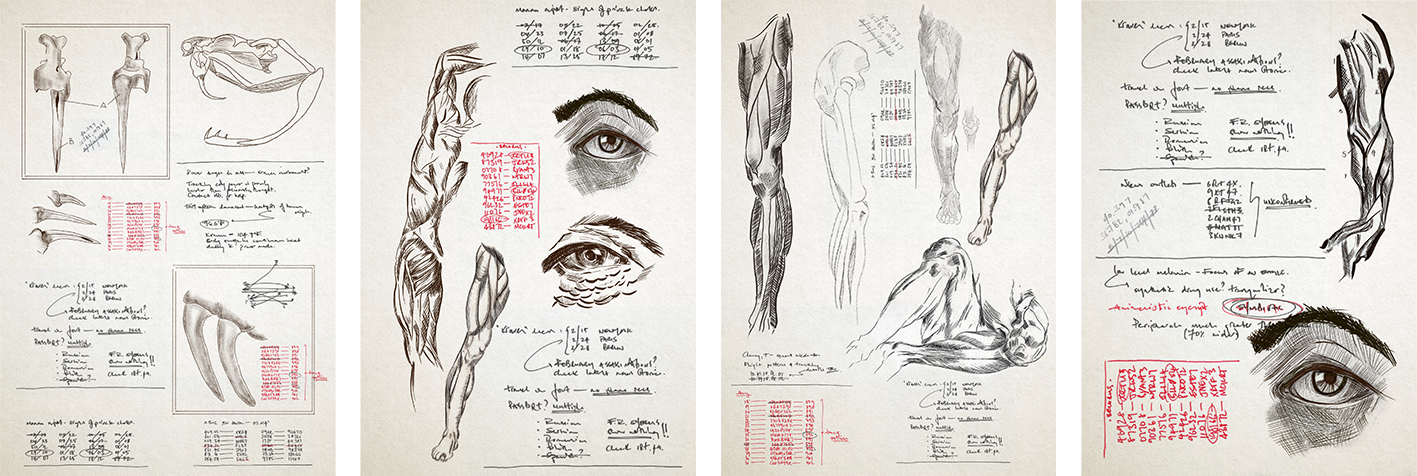 Hero notebook illustrations for lead character. Working from a brief to create illustrations for a lead characters notebook. Our lead character has been following a ‘baddie’ and making notes and illustrations in his notebook about the others characters appearance. Fifteen pages were requested in total and were printed and bound into the characters notebook to be used as a hero prop during filming.