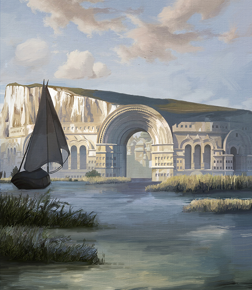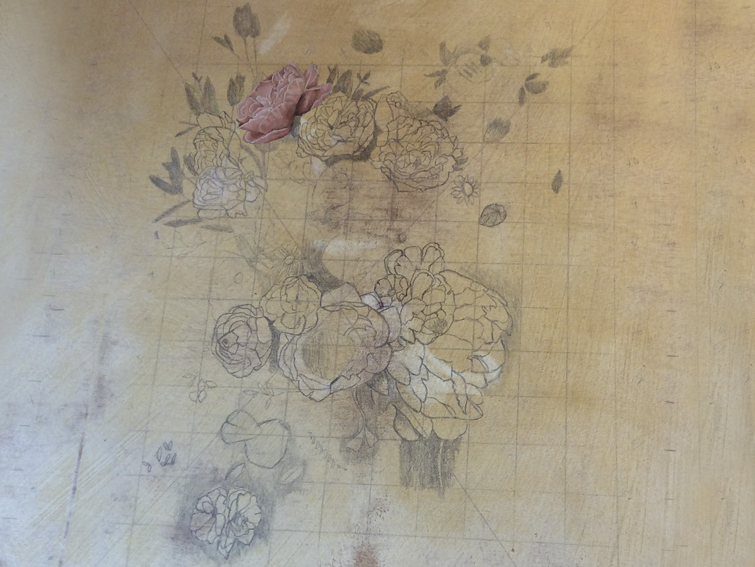 I started by priming and sealing the board with a modern gesso, then toning the board with an umber wash. I then started with a pencil outline to get all the elements in the right place. Next, I blocked all the elements in with a flat acrylic base coat in the local colour. I worked over the whole painting again in oil paint and finished all the details in oils as well, giving the final painting a nice semi-gloss finish. The final painting was delivered to set and aged by the onset scenic at the studios.