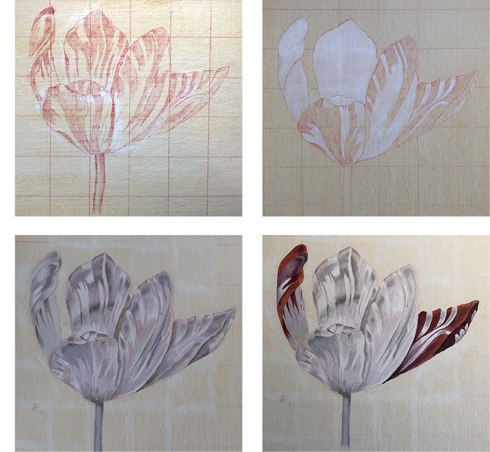 Tulip study in oil painting, was painting using Old Masters techniques of working in layers from a grisaille. Then applying thin glazes of colour to build up the depth.