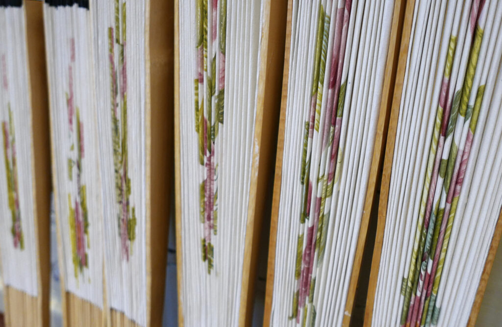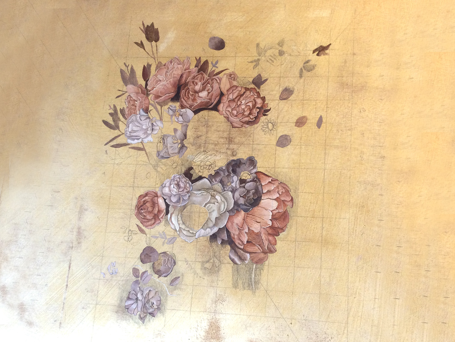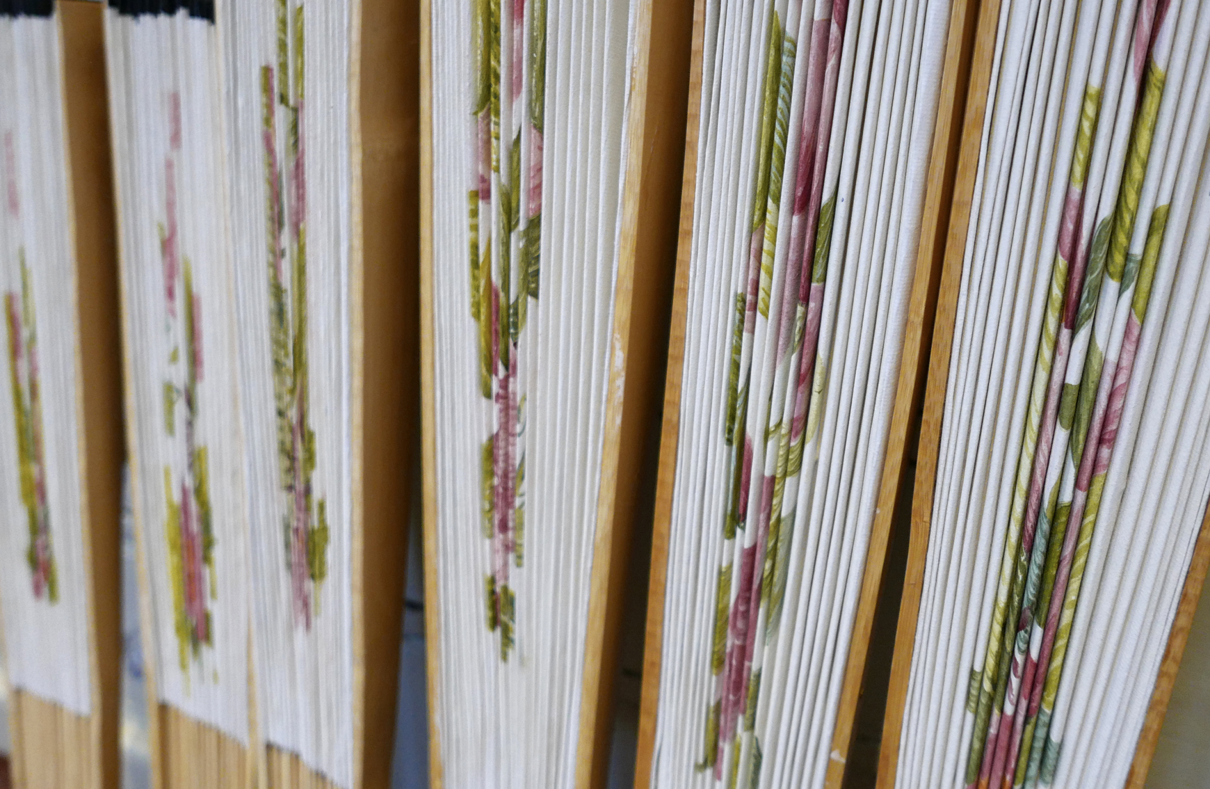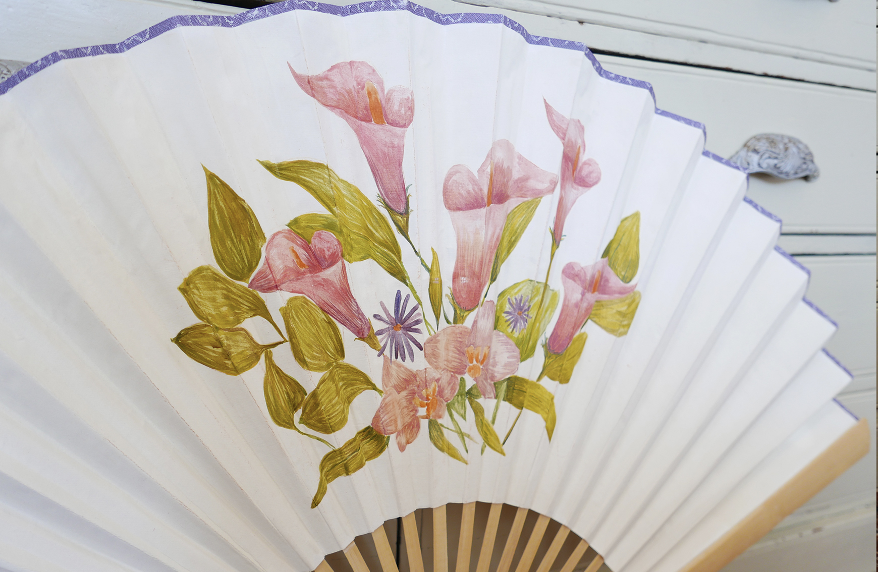 I handpainted twelve fans for set dressing, the floral design was provided for me. I scaled up the design and transferred it to each fan. Working in stages of block colour and then details to finish.