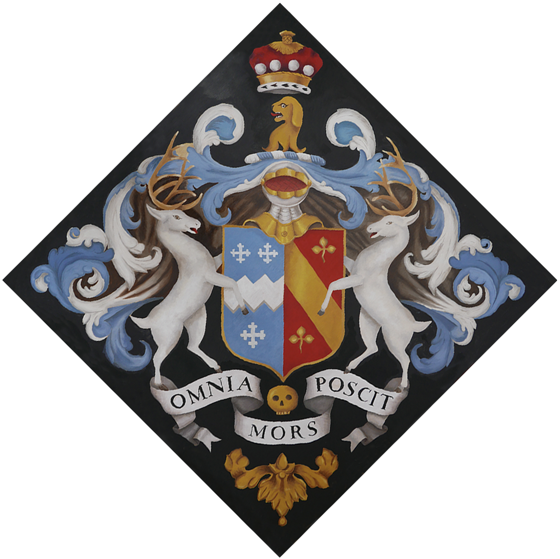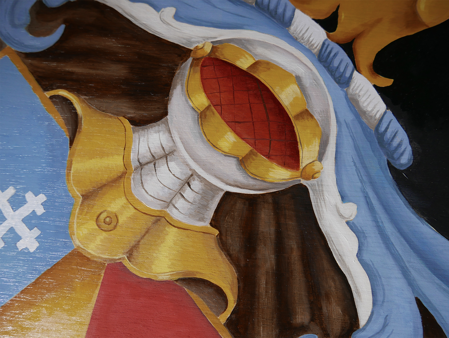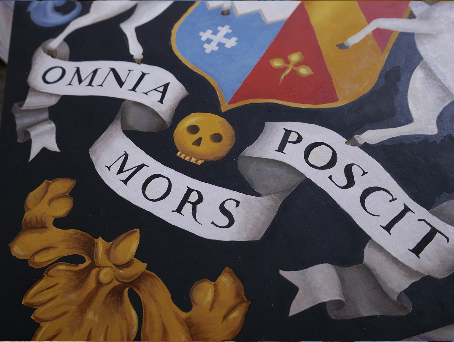 One meter square heraldic coat of arms. I was commissioned to paint a large herald for The Ballad of Renegade Nell. The layout and colour scheme was predetermined by the Graphic Designer as per the scrips, this also included colours that were to be matched and used.